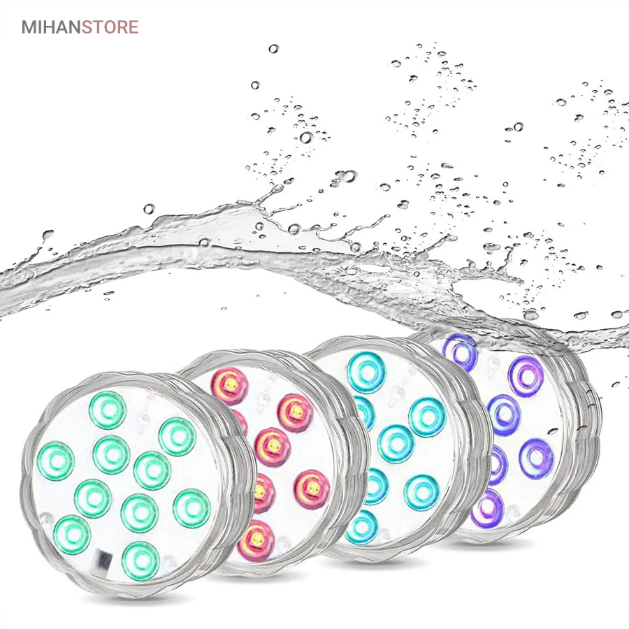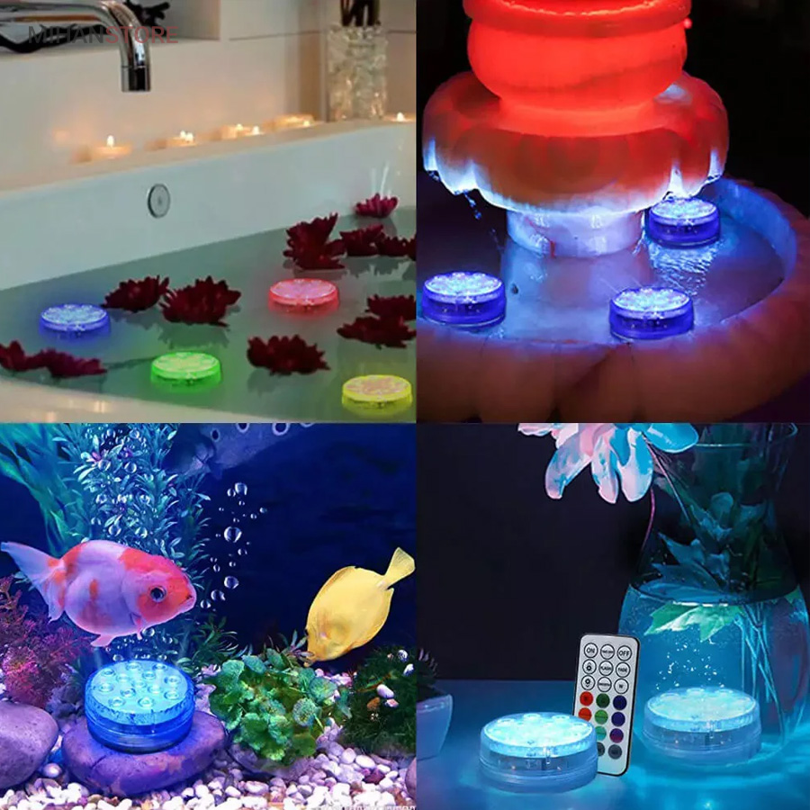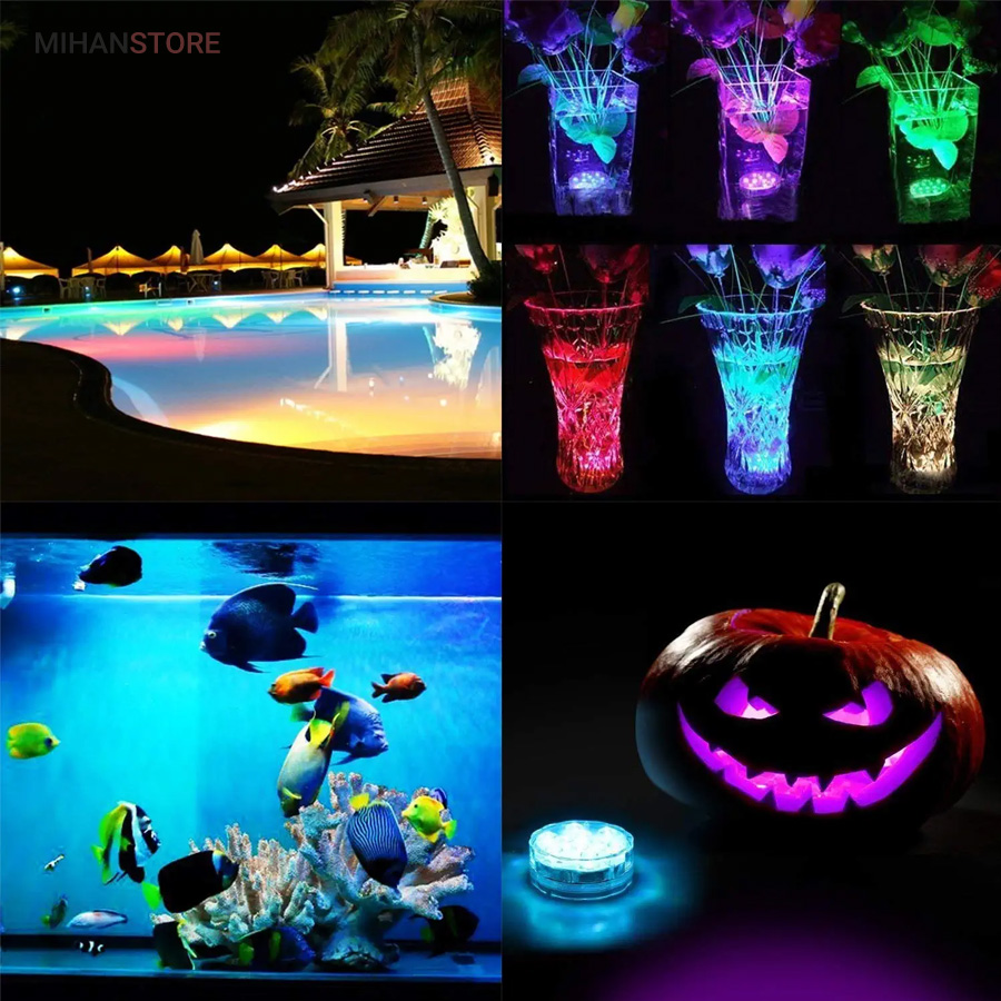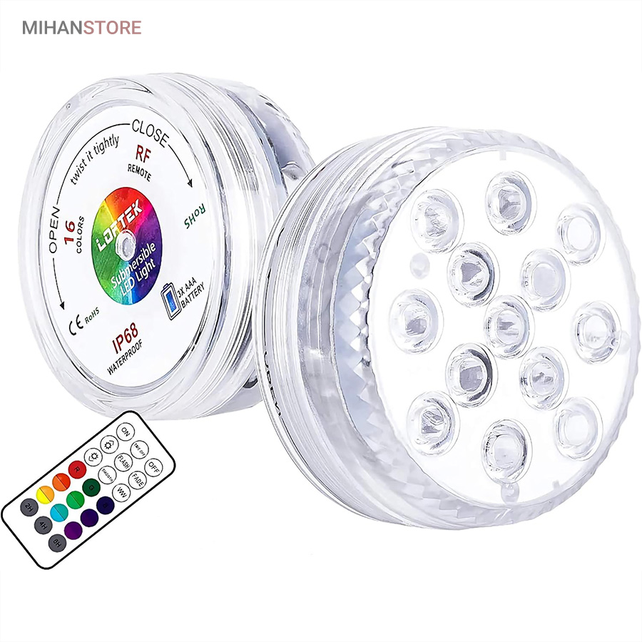چراغ LED ریموت دار ضد آب دارای LED RGB قابلیت تولید انواع رنگها را دارد. ضمنا با توجه به داشتن ریموت کنترل امکان کنترل از راه دور را فراهم میکند. این پک LED می تواند رنگها و نورها را بصورت مستقل و یا ترکیبی و با حالتهای متفاوت در سرعت چشمک زدن و تغییر رنگها از طیفی به طیف دیگر برای ایجاد جذابیت تولید نماید. با استفاده از ۳ عدد باتری نیم قلمی امکان کار تا ۷۲ ساعت بصورت مداوم برای این لامپ وجود دارد.