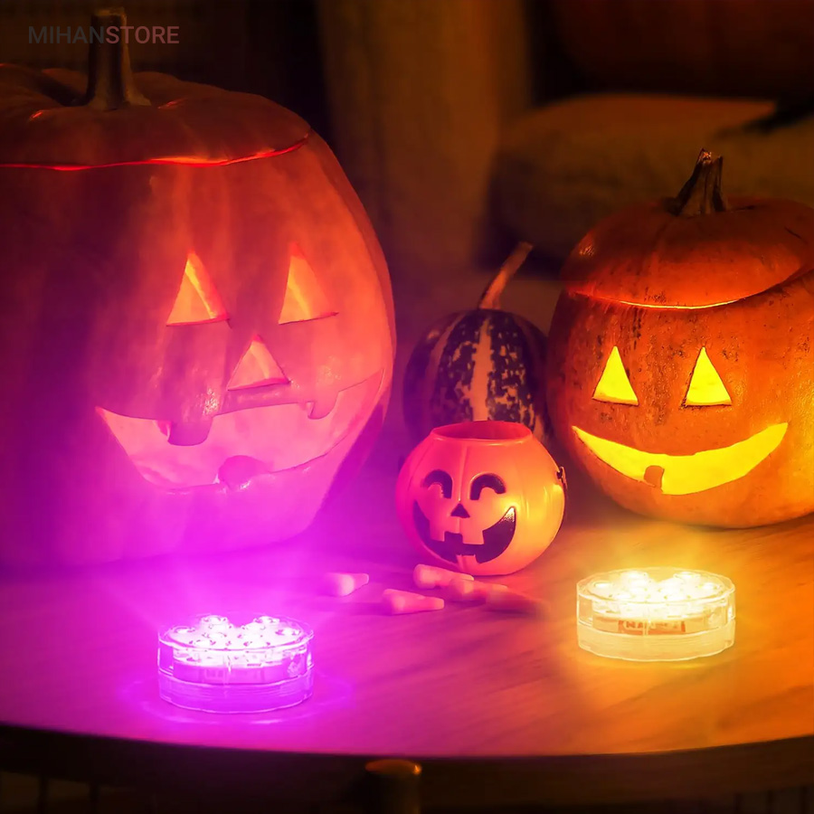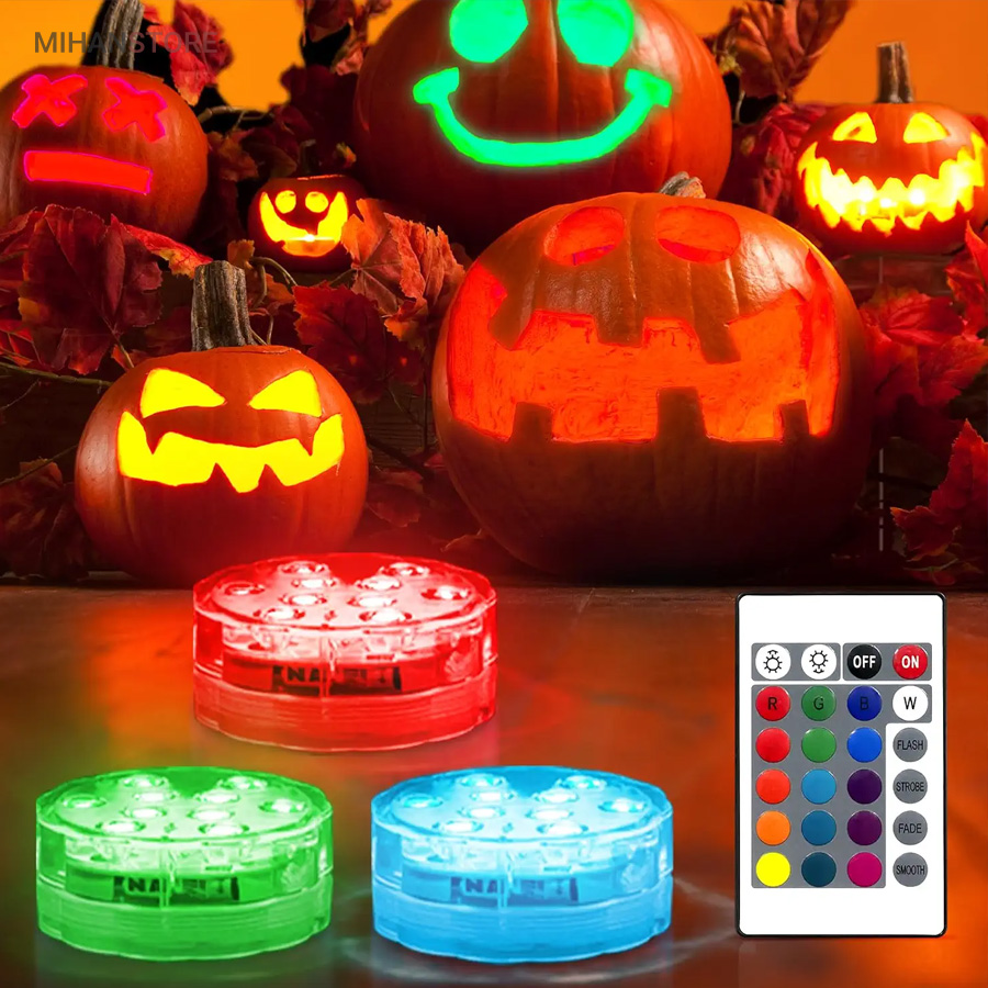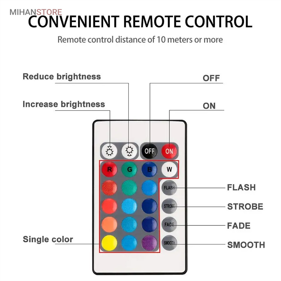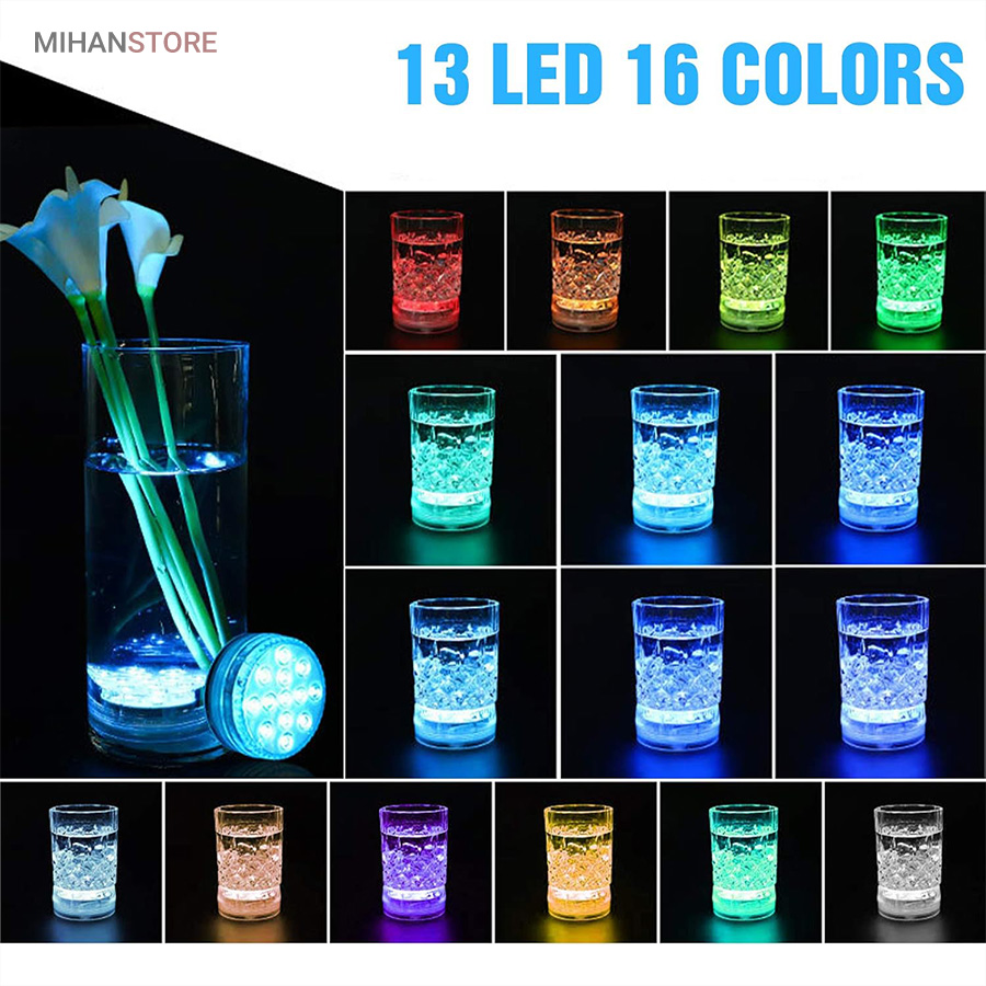 چراغ LED ریموت دار ضد آب دارای LED RGB قابلیت تولید انواع رنگها را دارد. ضمنا با توجه به داشتن ریموت کنترل امکان کنترل از راه دور را فراهم میکند. این پک LED می تواند رنگها و نورها را بصورت مستقل و یا ترکیبی و با حالتهای متفاوت در سرعت چشمک زدن و تغییر رنگها از طیفی به طیف دیگر برای ایجاد جذابیت تولید نماید. با استفاده از ۳ عدد باتری نیم قلمی امکان کار تا ۷۲ ساعت بصورت مداوم برای این لامپ وجود دارد.